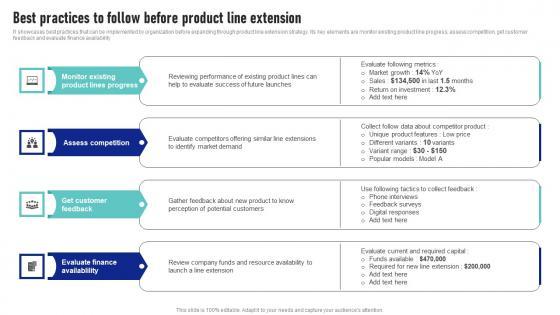 It showcases best practices that can be implemented by organization before expanding through product line extension strategy. Its key elements are monitor existing product line progress, assess competition, get customer feedback and evaluate finance availability Explore a selection of the finest Best Practices To Follow Maximizing Sales Via Online Brand Marketing Strategies Slides Pdf here. With a plethora of professionally designed and pre made slide templates, you can quickly and easily find the right one for your upcoming presentation. You can use our Best Practices To Follow Maximizing Sales Via Online Brand Marketing Strategies Slides Pdf to effectively convey your message to a wider audience. Slidegeeks has done a lot of research before preparing these presentation templates. The content can be personalized and the slides are highly editable. Grab templates today from Slidegeeks. It showcases best practices that can be implemented by organization before expanding through product line extension strategy. Its key elements are monitor existing product line progress, assess competition, get customer feedback and evaluate finance availability