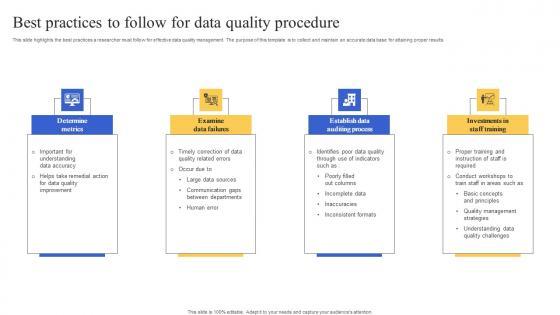 This slide highlights the best practices a researcher must follow for effective data quality management. The purpose of this template is to collect and maintain an accurate data base for attaining proper results. Showcasing this set of slides titled Best Practices To Follow For Data Quality Procedure Diagrams Pdf. The topics addressed in these templates are Examine Data Failures, Establish Data Auditing Process, Investments In Staff Training. All the content presented in this PPT design is completely editable. Download it and make adjustments in color, background, font etc. as per your unique business setting. This slide highlights the best practices a researcher must follow for effective data quality management. The purpose of this template is to collect and maintain an accurate data base for attaining proper results.