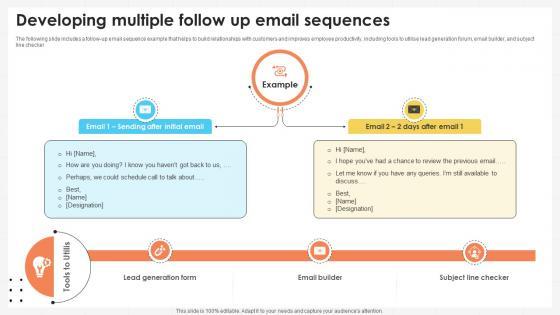 The following slide includes a follow-up email sequence example that helps to build relationships with customers and improves employee productivity, including tools to utilise lead generation forum, email builder, and subject line checker. Crafting an eye-catching presentation has never been more straightforward. Let your presentation shine with this tasteful yet straightforward Business Development Team Developing Multiple Follow Up Email Sequences SA SS V template. It offers a minimalistic and classy look that is great for making a statement. The colors have been employed intelligently to add a bit of playfulness while still remaining professional. Construct the ideal Business Development Team Developing Multiple Follow Up Email Sequences SA SS V that effortlessly grabs the attention of your audience Begin now and be certain to wow your customers The following slide includes a follow-up email sequence example that helps to build relationships with customers and improves employee productivity, including tools to utilise lead generation forum, email builder, and subject line checker.
