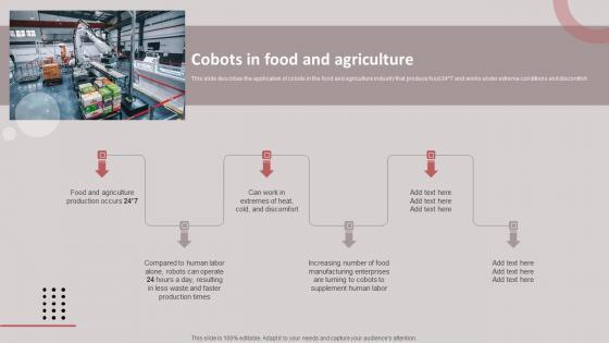 This slide describes the application of cobots in the food and agriculture industry that produce food 24 into 7 and works under extreme conditions and discomfort. Get a simple yet stunning designed Cobots In Food And Agriculture Detailed Analysis Of Cobots Ideas PDF. It is the best one to establish the tone in your meetings. It is an excellent way to make your presentations highly effective. So, download this PPT today from Slidegeeks and see the positive impacts. Our easy to edit Cobots In Food And Agriculture Detailed Analysis Of Cobots Ideas PDF can be your go to option for all upcoming conferences and meetings. So, what are you waiting for Grab this template today.