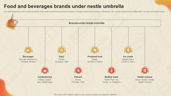 This slide mentions the various brand operated by nestle under its umbrella as per product category. It includes brands under beverage, confectionary, dairy, pet care, prepared food, bottled water, ice cream, and health science. Are you in need of a template that can accommodate all of your creative concepts This one is crafted professionally and can be altered to fit any style. Use it with Google Slides or PowerPoint. Include striking photographs, symbols, depictions, and other visuals. Fill, move around, or remove text boxes as desired. Test out color palettes and font mixtures. Edit and save your work, or work with colleagues. Download Decoding Nestles Marketing Food And Beverages Brands Under Nestle Umbrella Strategy SS V and observe how to make your presentation outstanding. Give an impeccable presentation to your group and make your presentation unforgettable. This slide mentions the various brand operated by nestle under its umbrella as per product category. It includes brands under beverage, confectionary, dairy, pet care, prepared food, bottled water, ice cream, and health science.