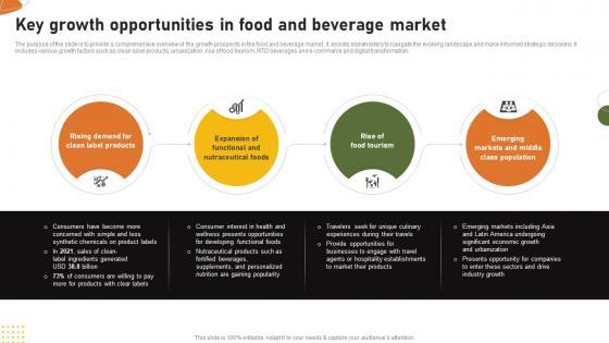 The purpose of the slide is to provide a comprehensive overview of the growth prospects in the food and beverage market. It assists stakeholders to navigate the evolving landscape and make informed strategic decisions. It includes various growth factors such as clean label products, urbanization, rise of food tourism, RTD beverages and e-commerce and digital transformation. Make sure to capture your audiences attention in your business displays with our gratis customizable Food And Drink Industry Report Key Growth Opportunities In Food And Beverage Market IR SS V. These are great for business strategies, office conferences, capital raising or task suggestions. If you desire to acquire more customers for your tech business and ensure they stay satisfied, create your own sales presentation with these plain slides. The purpose of the slide is to provide a comprehensive overview of the growth prospects in the food and beverage market. It assists stakeholders to navigate the evolving landscape and make informed strategic decisions. It includes various growth factors such as clean label products, urbanization, rise of food tourism, RTD beverages and e-commerce and digital transformation.