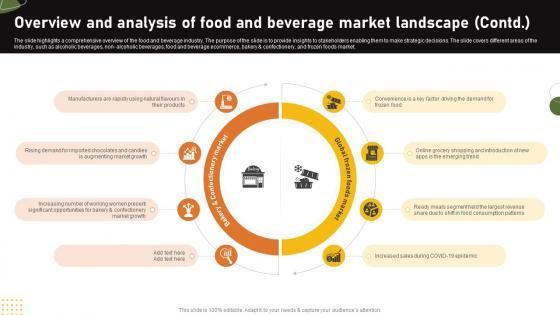The slide highlights a comprehensive overview of the food and beverage industry. The purpose of the slide is to provide insights to stakeholders enabling them to make strategic decisions. The slide covers different areas of the industry, such as alcoholic beverages, non- alcoholic beverages, food and beverage ecommerce, bakery and confectionery, and frozen foods market. This modern and well-arranged Food And Drink Industry Report Overview And Analysis Of Food And Beverage Market Landscape IR SS V provides lots of creative possibilities. It is very simple to customize and edit with the Powerpoint Software. Just drag and drop your pictures into the shapes. All facets of this template can be edited with Powerpoint, no extra software is necessary. Add your own material, put your images in the places assigned for them, adjust the colors, and then you can show your slides to the world, with an animated slide included. The slide highlights a comprehensive overview of the food and beverage industry. The purpose of the slide is to provide insights to stakeholders enabling them to make strategic decisions. The slide covers different areas of the industry, such as alcoholic beverages, non- alcoholic beverages, food and beverage ecommerce, bakery and confectionery, and frozen foods market.