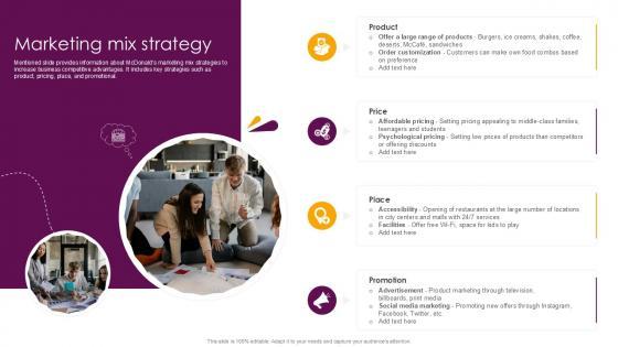 Mentioned slide provides information about McDonalds marketing mix strategies to increase business competitive advantages. It includes key strategies such as product, pricing, place, and promotional. The Marketing Mix Strategy Food And Beverages Company Profile Ppt Template CP SS V is a compilation of the most recent design trends as a series of slides. It is suitable for any subject or industry presentation, containing attractive visuals and photo spots for businesses to clearly express their messages. This template contains a variety of slides for the user to input data, such as structures to contrast two elements, bullet points, and slides for written information. Slidegeeks is prepared to create an impression. Mentioned slide provides information about McDonalds marketing mix strategies to increase business competitive advantages. It includes key strategies such as product, pricing, place, and promotional.