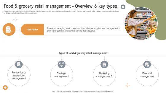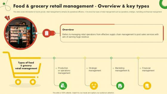 This slide covers introduction to food and grocery retail management to enhance its operational efficiency. It involves four types of retail management such as operations, strategic, marketing and financial management. If your project calls for a presentation, then Slidegeeks is your go-to partner because we have professionally designed, easy-to-edit templates that are perfect for any presentation. After downloading, you can easily edit Food And Grocery Retail Management Overview And Key Types Ppt Example and make the changes accordingly. You can rearrange slides or fill them with different images. Check out all the handy templates This slide covers introduction to food and grocery retail management to enhance its operational efficiency. It involves four types of retail management such as operations, strategic, marketing and financial management.