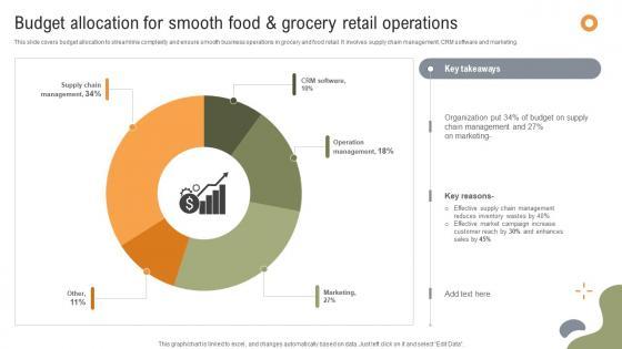 This slide covers budget allocation to streamline complexity and ensure smooth business operations in grocery and food retail. It involves supply chain management, CRM software and marketing. Do you have to make sure that everyone on your team knows about any specific topic I yes, then you should give Budget Allocation For Smooth Food And Grocery Retail Ppt Slide a try. Our experts have put a lot of knowledge and effort into creating this impeccable Budget Allocation For Smooth Food And Grocery Retail Ppt Slide. You can use this template for your upcoming presentations, as the slides are perfect to represent even the tiniest detail. You can download these templates from the Slidegeeks website and these are easy to edit. So grab these today This slide covers budget allocation to streamline complexity and ensure smooth business operations in grocery and food retail. It involves supply chain management, CRM software and marketing.