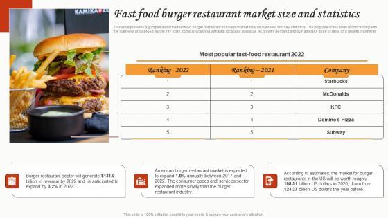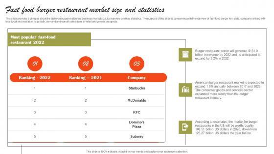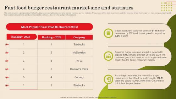 This slide provides a glimpse about the fast food burger restaurant business market size, its overview and key statistics. The purpose of this slide is concerning with the overview of fast-food burger key stats, company ranking with total locations available, its growth, demand and overall sales done by retail and growth prospects. If your project calls for a presentation, then Slidegeeks is your go-to partner because we have professionally designed, easy-to-edit templates that are perfect for any presentation. After downloading, you can easily edit Fast Food Burger Restaurant Market Size And Statistics Fast Food Business Plan Graphics Pdf and make the changes accordingly. You can rearrange slides or fill them with different images. Check out all the handy templates This slide provides a glimpse about the fast food burger restaurant business market size, its overview and key statistics. The purpose of this slide is concerning with the overview of fast-food burger key stats, company ranking with total locations available, its growth, demand and overall sales done by retail and growth prospects.