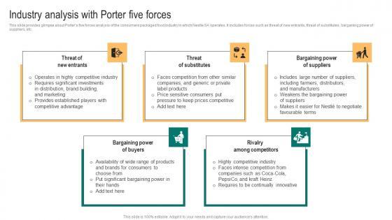 This slide provides glimpse about Porters five forces analysis of the consumers packaged food industry in which Nestle SA operates. It includes forces such as threat of new entrants, threat of substitutes, bargaining power of suppliers, etc. Are you in need of a template that can accommodate all of your creative concepts This one is crafted professionally and can be altered to fit any style. Use it with Google Slides or PowerPoint. Include striking photographs, symbols, depictions, and other visuals. Fill, move around, or remove text boxes as desired. Test out color palettes and font mixtures. Edit and save your work, or work with colleagues. Download Packaged Food Business Industry Analysis With Porter Five Forces Introduction Pdf and observe how to make your presentation outstanding. Give an impeccable presentation to your group and make your presentation unforgettable. This slide provides glimpse about Porters five forces analysis of the consumers packaged food industry in which Nestle SA operates. It includes forces such as threat of new entrants, threat of substitutes, bargaining power of suppliers, etc.