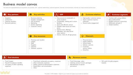 This slide showcases elements such as partners, key activities, USP, customer relationships, customer segments, channels, revenue streams, channels, key resources and cost structure. Find a pre designed and impeccable Business Model Canvas Fast Food Retail Chain Business Model BMC SS V The templates can ace your presentation without additional effort. You can download these easy to edit presentation templates to make your presentation stand out from others. So, what are you waiting for Download the template from Slidegeeks today and give a unique touch to your presentation. This slide showcases elements such as partners, key activities, USP, customer relationships, customer segments, channels, revenue streams, channels, key resources and cost structure.