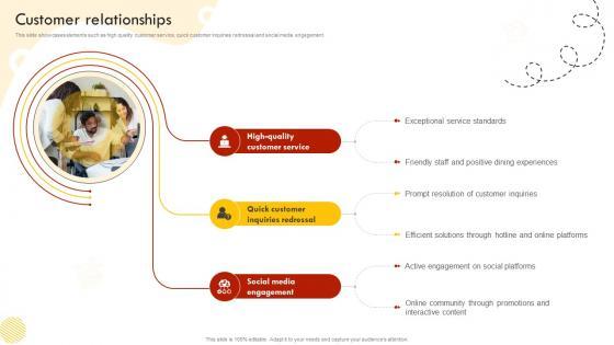 This slide showcases elements such as high quality customer service, quick customer inquiries redressal and social media engagement. Slidegeeks is one of the best resources for PowerPoint templates. You can download easily and regulate Customer Relationships Fast Food Retail Chain Business Model BMC SS V for your personal presentations from our wonderful collection. A few clicks is all it takes to discover and get the most relevant and appropriate templates. Use our Templates to add a unique zing and appeal to your presentation and meetings. All the slides are easy to edit and you can use them even for advertisement purposes. This slide showcases elements such as high quality customer service, quick customer inquiries redressal and social media engagement.