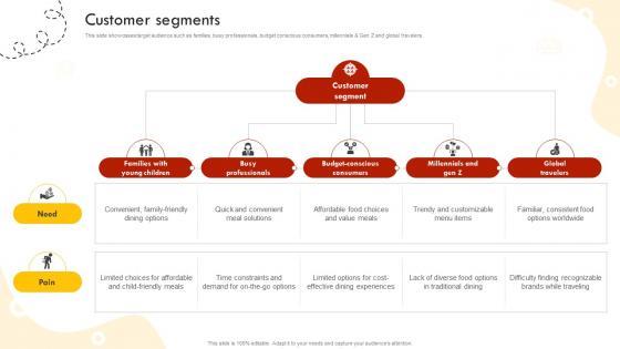This slide showcases target audience such as families, busy professionals, budget conscious consumers, millennials and Gen Z and global travelers. Want to ace your presentation in front of a live audience Our Customer Segments Fast Food Retail Chain Business Model BMC SS V can help you do that by engaging all the users towards you. Slidegeeks experts have put their efforts and expertise into creating these impeccable powerpoint presentations so that you can communicate your ideas clearly. Moreover, all the templates are customizable, and easy to edit and downloadable. Use these for both personal and commercial use. This slide showcases target audience such as families, busy professionals, budget conscious consumers, millennials and Gen Z and global travelers.