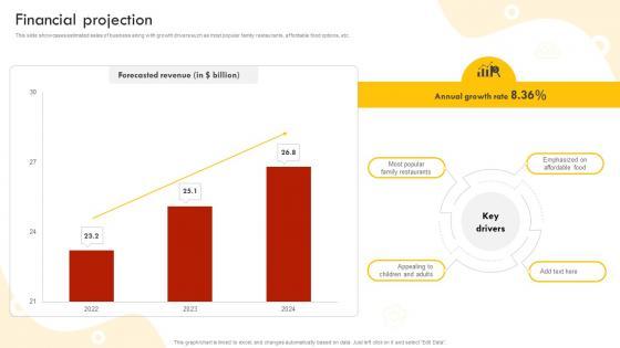 This slide showcases estimated sales of business along with growth drivers such as most popular family restaurants, affordable food options, etc. There are so many reasons you need a Financial Projection Fast Food Retail Chain Business Model BMC SS V The first reason is you can not spend time making everything from scratch, Thus, Slidegeeks has made presentation templates for you too. You can easily download these templates from our website easily. This slide showcases estimated sales of business along with growth drivers such as most popular family restaurants, affordable food options, etc.