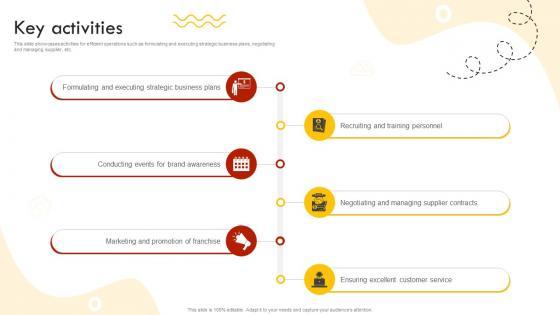 This slide showcases activities for efficient operations such as formulating and executing strategic business plans, negotiating and managing supplier, etc. Get a simple yet stunning designed Key Activities Fast Food Retail Chain Business Model BMC SS V It is the best one to establish the tone in your meetings. It is an excellent way to make your presentations highly effective. So, download this PPT today from Slidegeeks and see the positive impacts. Our easy to edit Key Activities Fast Food Retail Chain Business Model BMC SS V can be your go to option for all upcoming conferences and meetings. So, what are you waiting for Grab this template today. This slide showcases activities for efficient operations such as formulating and executing strategic business plans, negotiating and managing supplier, etc.