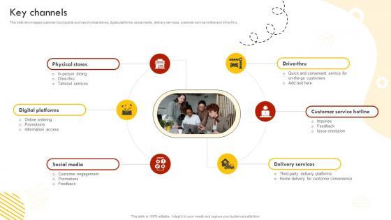 This slide showcases customer touchpoints such as physical stores, digital platforms, social media, delivery services, customer service hotline and drive thru. From laying roadmaps to briefing everything in detail, our templates are perfect for you. You can set the stage with your presentation slides. All you have to do is download these easy to edit and customizable templates. Key Channels Fast Food Retail Chain Business Model BMC SS V will help you deliver an outstanding performance that everyone would remember and praise you for. Do download this presentation today. This slide showcases customer touchpoints such as physical stores, digital platforms, social media, delivery services, customer service hotline and drive thru.