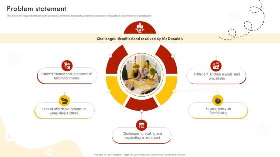This slide showcases challenges such as speed and efficiency, food quality, business expansion, affordability and value meals and globalization. Whether you have daily or monthly meetings, a brilliant presentation is necessary. Problem Statement Fast Food Retail Chain Business Model BMC SS V can be your best option for delivering a presentation. Represent everything in detail using Problem Statement Fast Food Retail Chain Business Model BMC SS V and make yourself stand out in meetings. The template is versatile and follows a structure that will cater to your requirements. All the templates prepared by Slidegeeks are easy to download and edit. Our research experts have taken care of the corporate themes as well. So, give it a try and see the results. This slide showcases challenges such as speed and efficiency, food quality, business expansion, affordability and value meals and globalization.