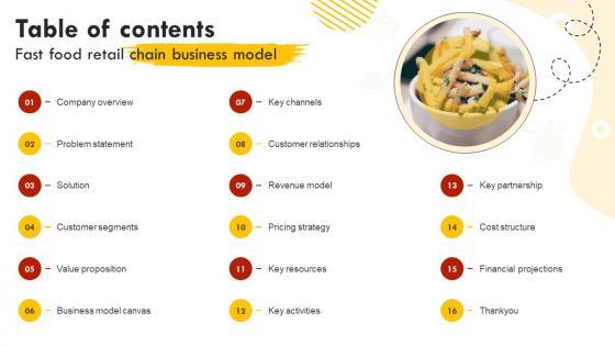 If you are looking for a format to display your unique thoughts, then the professionally designed Table Of Contents Fast Food Retail Chain Business Model BMC SS V is the one for you. You can use it as a Google Slides template or a PowerPoint template. Incorporate impressive visuals, symbols, images, and other charts. Modify or reorganize the text boxes as you desire. Experiment with shade schemes and font pairings. Alter, share or cooperate with other people on your work. Download Table Of Contents Fast Food Retail Chain Business Model BMC SS V and find out how to give a successful presentation. Present a perfect display to your team and make your presentation unforgettable. Our Table Of Contents Fast Food Retail Chain Business Model BMC SS V are topically designed to provide an attractive backdrop to any subject. Use them to look like a presentation pro.