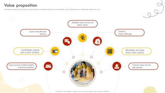 This slide showcases USP such as convenient locations, comfortable seating and in store facilities, quick and efficient service, reliable taste, distinct menu, etc. Are you in need of a template that can accommodate all of your creative concepts This one is crafted professionally and can be altered to fit any style. Use it with Google Slides or PowerPoint. Include striking photographs, symbols, depictions, and other visuals. Fill, move around, or remove text boxes as desired. Test out color palettes and font mixtures. Edit and save your work, or work with colleagues. Download Value Proposition Fast Food Retail Chain Business Model BMC SS V and observe how to make your presentation outstanding. Give an impeccable presentation to your group and make your presentation unforgettable. This slide showcases USP such as convenient locations, comfortable seating and in store facilities, quick and efficient service, reliable taste, distinct menu, etc.