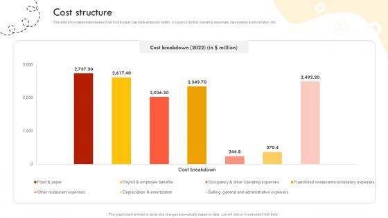 This slide showcases expenses such as food and paper, payroll and employee health, occupancy and other operating expenses, depreciation and amortization, etc. Create an editable Cost Structure Fast Food Retail Chain Business Model BMC SS V that communicates your idea and engages your audience. Whether you are presenting a business or an educational presentation, pre designed presentation templates help save time. Cost Structure Fast Food Retail Chain Business Model BMC SS V is highly customizable and very easy to edit, covering many different styles from creative to business presentations. Slidegeeks has creative team members who have crafted amazing templates. So, go and get them without any delay. This slide showcases expenses such as food and paper, payroll and employee health, occupancy and other operating expenses, depreciation and amortization, etc.