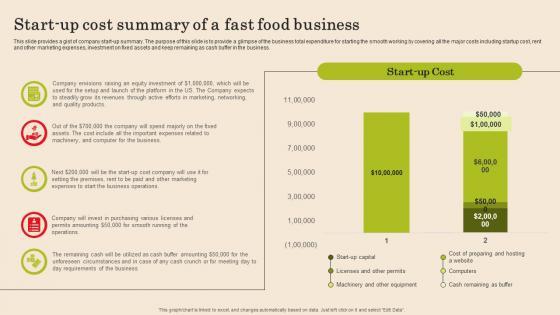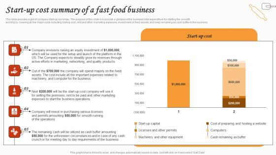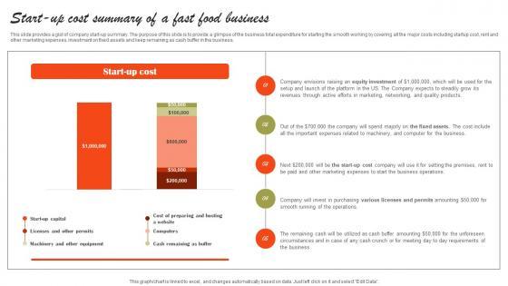 This slide provides a gist of company start-up summary. The purpose of this slide is to provide a glimpse of the business total expenditure for starting the smooth working by covering all the major costs including startup cost, rent and other marketing expenses, investment on fixed assets and keep remaining as cash buffer in the business. Do you have an important presentation coming up Are you looking for something that will make your presentation stand out from the rest Look no further than Start Up Cost Summary Of A Fast Food Business Small Restaurant Business Slides Pdf With our professional designs, you can trust that your presentation will pop and make delivering it a smooth process. And with Slidegeeks, you can trust that your presentation will be unique and memorable. So why wait Grab Start Up Cost Summary Of A Fast Food Business Small Restaurant Business Slides Pdf today and make your presentation stand out from the rest. This slide provides a gist of company start-up summary. The purpose of this slide is to provide a glimpse of the business total expenditure for starting the smooth working by covering all the major costs including startup cost, rent and other marketing expenses, investment on fixed assets and keep remaining as cash buffer in the business.