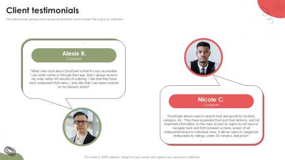 This slide provides glimpse about reviews and feedback about company that is given by customers. Retrieve professionally designed Client Testimonials Food Delivery Platform Investor Funding Elevator Pitch Deck PPT Slides to effectively convey your message and captivate your listeners. Save time by selecting pre made slideshows that are appropriate for various topics, from business to educational purposes. These themes come in many different styles, from creative to corporate, and all of them are easily adjustable and can be edited quickly. Access them as PowerPoint templates or as Google Slides themes. You do not have to go on a hunt for the perfect presentation because Slidegeeks got you covered from everywhere. This slide provides glimpse about reviews and feedback about company that is given by customers.