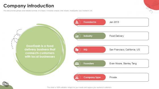 This slide provides glimpse about detailed summary of company. It includes company brief, industry, headquarter, type, founded in, etc. Slidegeeks has constructed Company Introduction Food Delivery Platform Investor Funding Elevator Pitch Deck PPT Template after conducting extensive research and examination. These presentation templates are constantly being generated and modified based on user preferences and critiques from editors. Here, you will find the most attractive templates for a range of purposes while taking into account ratings and remarks from users regarding the content. This is an excellent jumping off point to explore our content and will give new users an insight into our top notch PowerPoint Templates. This slide provides glimpse about detailed summary of company. It includes company brief, industry, headquarter, type, founded in, etc.