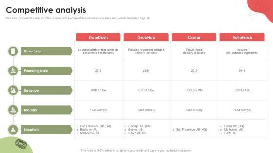 This slide represents the analysis of the company with its competitors and similar companies along with its description, tags, etc. Presenting this PowerPoint presentation, titled Competitive Analysis Food Delivery Platform Investor Funding Elevator Pitch Deck PPT PowerPoint, with topics curated by our researchers after extensive research. This editable presentation is available for immediate download and provides attractive features when used. Download now and captivate your audience. Presenting this Competitive Analysis Food Delivery Platform Investor Funding Elevator Pitch Deck PPT PowerPoint. Our researchers have carefully researched and created these slides with all aspects taken into consideration. This is a completely customizable Competitive Analysis Food Delivery Platform Investor Funding Elevator Pitch Deck PPT PowerPoint that is available for immediate downloading. Download now and make an impact on your audience. Highlight the attractive features available with our PPTs. This slide represents the analysis of the company with its competitors and similar companies along with its description, tags, etc.