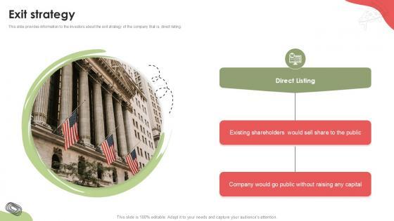 This slide provides information to the investors about the exit strategy of the company that is, direct listing. Do you know about Slidesgeeks Exit Strategy Food Delivery Platform Investor Funding Elevator Pitch Deck PPT PowerPoint These are perfect for delivering any kind od presentation. Using it, create PowerPoint presentations that communicate your ideas and engage audiences. Save time and effort by using our pre designed presentation templates that are perfect for a wide range of topic. Our vast selection of designs covers a range of styles, from creative to business, and are all highly customizable and easy to edit. Download as a PowerPoint template or use them as Google Slides themes. This slide provides information to the investors about the exit strategy of the company that is, direct listing.
