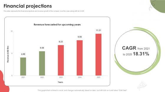 This slide represents the financial projections and revenue growth of the company over the years along with its CAGR. Boost your pitch with our creative Financial Projections Food Delivery Platform Investor Funding Elevator Pitch Deck PPT Template. Deliver an awe inspiring pitch that will mesmerize everyone. Using these presentation templates you will surely catch everyones attention. You can browse the ppts collection on our website. We have researchers who are experts at creating the right content for the templates. So you do not have to invest time in any additional work. Just grab the template now and use them. This slide represents the financial projections and revenue growth of the company over the years along with its CAGR.