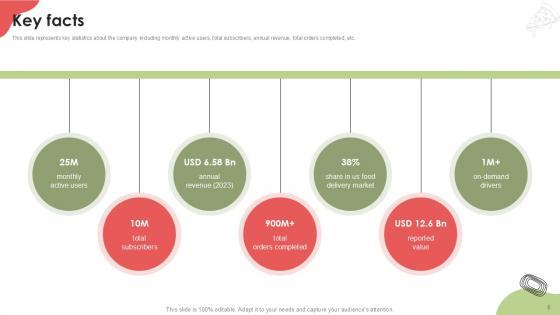 This slide represents key statistics about the company including monthly active users, total subscribers, annual revenue, total orders completed, etc. There are so many reasons you need a Key Facts Food Delivery Platform Investor Funding Elevator Pitch Deck PPT Sample. The first reason is you can not spend time making everything from scratch, Thus, Slidegeeks has made presentation templates for you too. You can easily download these templates from our website easily. This slide represents key statistics about the company including monthly active users, total subscribers, annual revenue, total orders completed, etc.