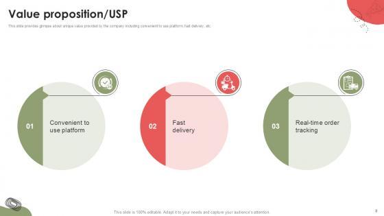 This slide provides glimpse about unique value provided by the company including convenient to use platform, fast delivery, etc. If you are looking for a format to display your unique thoughts, then the professionally designed Value Proposition USP Food Delivery Platform Investor Funding Elevator Pitch Deck PPT Template is the one for you. You can use it as a Google Slides template or a PowerPoint template. Incorporate impressive visuals, symbols, images, and other charts. Modify or reorganize the text boxes as you desire. Experiment with shade schemes and font pairings. Alter, share or cooperate with other people on your work. Download Value Proposition USP Food Delivery Platform Investor Funding Elevator Pitch Deck PPT Template and find out how to give a successful presentation. Present a perfect display to your team and make your presentation unforgettable. This slide provides glimpse about unique value provided by the company including convenient to use platform, fast delivery, etc.
