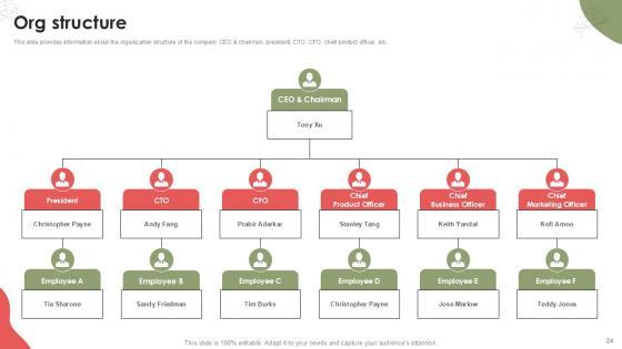 This slide provides information about the organization structure of the company CEO and chairman, president, CTO, CFO, chief product officer, etc. From laying roadmaps to briefing everything in detail, our templates are perfect for you. You can set the stage with your presentation slides. All you have to do is download these easy to edit and customizable templates. Org Structure Food Delivery Platform Investor Funding Elevator Pitch Deck PPT Template will help you deliver an outstanding performance that everyone would remember and praise you for. Do download this presentation today. This slide provides information about the organization structure of the company CEO and chairman, president, CTO, CFO, chief product officer, etc.