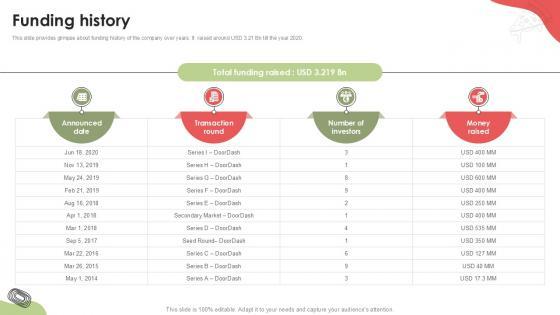 This slide provides glimpse about funding history of the company over years. It raised around USD 3.21 Bn till the year 2020. Create an editable Funding History Food Delivery Platform Investor Funding Elevator Pitch Deck PPT Slides that communicates your idea and engages your audience. Whether you are presenting a business or an educational presentation, pre designed presentation templates help save time. Funding History Food Delivery Platform Investor Funding Elevator Pitch Deck PPT Slides is highly customizable and very easy to edit, covering many different styles from creative to business presentations. Slidegeeks has creative team members who have crafted amazing templates. So, go and get them without any delay. This slide provides glimpse about funding history of the company over years. It raised around USD 3.21 Bn till the year 2020.