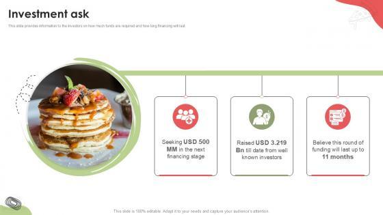 This slide provides information to the investors on how much funds are required and how long financing will last. Want to ace your presentation in front of a live audience Our Investment Ask Food Delivery Platform Investor Funding Elevator Pitch Deck PPT Sample can help you do that by engaging all the users towards you. Slidegeeks experts have put their efforts and expertise into creating these impeccable powerpoint presentations so that you can communicate your ideas clearly. Moreover, all the templates are customizable, and easy to edit and downloadable. Use these for both personal and commercial use. This slide provides information to the investors on how much funds are required and how long financing will last.