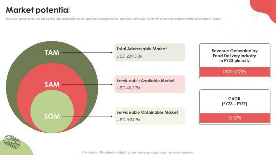 This slide represents the data that signifies total addressable market, serviceable available market, serviceable obtainable market with revenue generated worldwide in food delivery industry. Get a simple yet stunning designed Market Potential Food Delivery Platform Investor Funding Elevator Pitch Deck PPT PowerPoint. It is the best one to establish the tone in your meetings. It is an excellent way to make your presentations highly effective. So, download this PPT today from Slidegeeks and see the positive impacts. Our easy to edit Market Potential Food Delivery Platform Investor Funding Elevator Pitch Deck PPT PowerPoint can be your go to option for all upcoming conferences and meetings. So, what are you waiting for Grab this template today. This slide represents the data that signifies total addressable market, serviceable available market, serviceable obtainable market with revenue generated worldwide in food delivery industry.