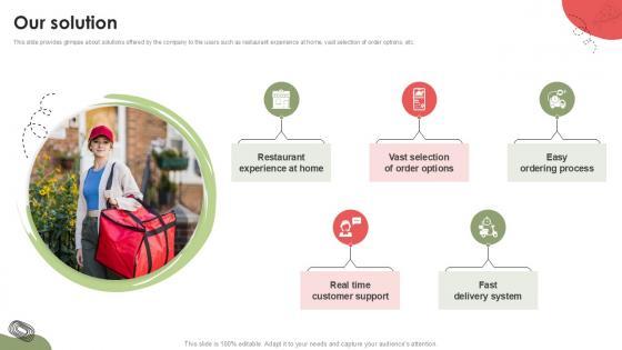 This slide provides glimpse about solutions offered by the company to the users such as restaurant experience at home, vast selection of order options, etc. Present like a pro with Our Solution Food Delivery Platform Investor Funding Elevator Pitch Deck PPT PowerPoint. Create beautiful presentations together with your team, using our easy to use presentation slides. Share your ideas in real time and make changes on the fly by downloading our templates. So whether you are in the office, on the go, or in a remote location, you can stay in sync with your team and present your ideas with confidence. With Slidegeeks presentation got a whole lot easier. Grab these presentations today. This slide provides glimpse about solutions offered by the company to the users such as restaurant experience at home, vast selection of order options, etc.