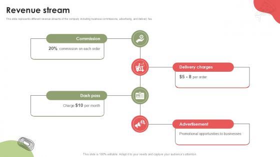 This slide represents different revenue streams of the company including business commissions, advertising, and delivery fee. Whether you have daily or monthly meetings, a brilliant presentation is necessary. Revenue Stream Food Delivery Platform Investor Funding Elevator Pitch Deck PPT Sample can be your best option for delivering a presentation. Represent everything in detail using Revenue Stream Food Delivery Platform Investor Funding Elevator Pitch Deck PPT Sample and make yourself stand out in meetings. The template is versatile and follows a structure that will cater to your requirements. All the templates prepared by Slidegeeks are easy to download and edit. Our research experts have taken care of the corporate themes as well. So, give it a try and see the results. This slide represents different revenue streams of the company including business commissions, advertising, and delivery fee.