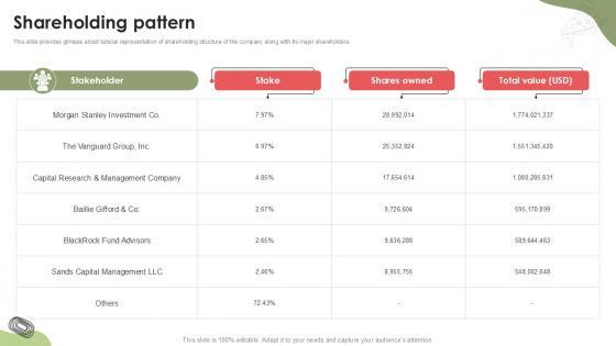 This slide provides glimpse about tabular representation of shareholding structure of the company along with its major shareholders. Find highly impressive Shareholding Pattern Food Delivery Platform Investor Funding Elevator Pitch Deck PPT Template on Slidegeeks to deliver a meaningful presentation. You can save an ample amount of time using these presentation templates. No need to worry to prepare everything from scratch because Slidegeeks experts have already done a huge research and work for you. You need to download Shareholding Pattern Food Delivery Platform Investor Funding Elevator Pitch Deck PPT Template for your upcoming presentation. All the presentation templates are 100 percent editable and you can change the color and personalize the content accordingly. Download now This slide provides glimpse about tabular representation of shareholding structure of the company along with its major shareholders.