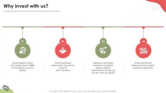 This slide represents the reasons for why should investors put their money with us. Are you in need of a template that can accommodate all of your creative concepts This one is crafted professionally and can be altered to fit any style. Use it with Google Slides or PowerPoint. Include striking photographs, symbols, depictions, and other visuals. Fill, move around, or remove text boxes as desired. Test out color palettes and font mixtures. Edit and save your work, or work with colleagues. Download Why Invest With Us Food Delivery Platform Investor Funding Elevator Pitch Deck PPT PowerPoint and observe how to make your presentation outstanding. Give an impeccable presentation to your group and make your presentation unforgettable. This slide represents the reasons for why should investors put their money with us.