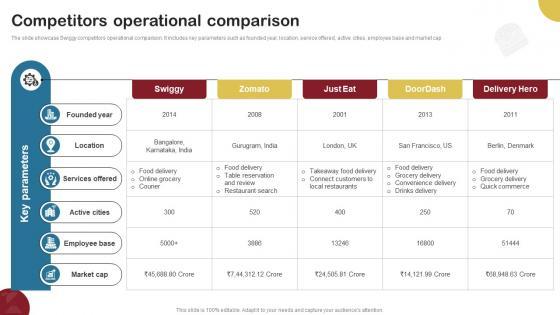 The slide showcase Swiggy competitors operational comparison. It includes key parameters such as founded year, location, service offered, active cities, employee base and market cap. From laying roadmaps to briefing everything in detail, our templates are perfect for you. You can set the stage with your presentation slides. All you have to do is download these easy-to-edit and customizable templates. Competitors Operational Comparison Food Delivery Company Profile CP SS V will help you deliver an outstanding performance that everyone would remember and praise you for. Do download this presentation today. The slide showcase Swiggy competitors operational comparison. It includes key parameters such as founded year, location, service offered, active cities, employee base and market cap.