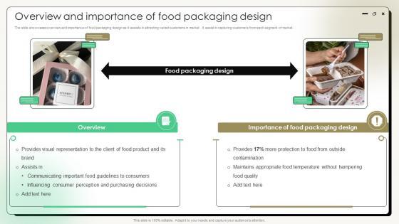 The slide showcases overview and importance of food packaging design as it assists in attracting varied customers in market. It assist in capturing customers from each segment of market. Explore a selection of the finest Comprehensive Guide On Current Strategies Overview And Importance Of Food Packaging Design here. With a plethora of professionally designed and pre-made slide templates, you can quickly and easily find the right one for your upcoming presentation. You can use our Comprehensive Guide On Current Strategies Overview And Importance Of Food Packaging Design to effectively convey your message to a wider audience. Slidegeeks has done a lot of research before preparing these presentation templates. The content can be personalized and the slides are highly editable. Grab templates today from Slidegeeks. The slide showcases overview and importance of food packaging design as it assists in attracting varied customers in market. It assist in capturing customers from each segment of market.