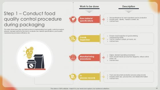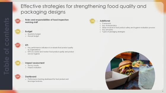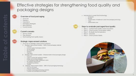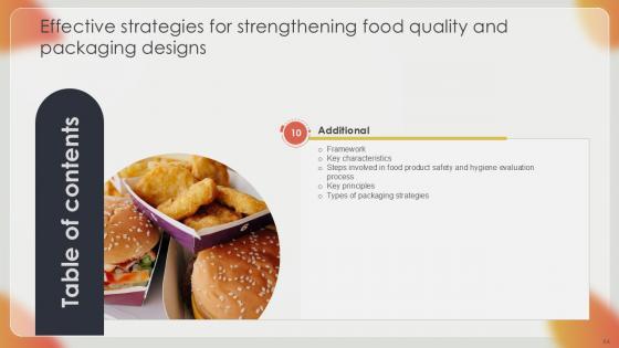 This Effective Strategies For Strengthening Food Quality And Packaging Designs Ppt Sample is a primer on how to capitalize on business opportunities through planning, innovation, and market intelligence. The content-ready format of the complete deck will make your job as a decision-maker a lot easier. Use this ready-made PowerPoint Template to help you outline an extensive and legible plan to capture markets and grow your company on the right path, at an exponential pace. What is even more amazing is that this presentation is completely editable and 100 percent customizable. This seventy seven-slide complete deck helps you impress a roomful of people with your expertise in business and even presentation. Craft such a professional and appealing presentation for that amazing recall value. Download now. Our Effective Strategies For Strengthening Food Quality And Packaging Designs Ppt Sample are topically designed to provide an attractive backdrop to any subject. Use them to look like a presentation pro.