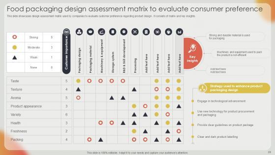 This slide showcases design assessment matrix used by companies to evaluate customer preference regarding product design . It consists of matrix and key insights. Present like a pro with Food Packaging Design Assessment Effective Strategies For Strengthening Food Ppt Template. Create beautiful presentations together with your team, using our easy-to-use presentation slides. Share your ideas in real-time and make changes on the fly by downloading our templates. So whether you are in the office, on the go, or in a remote location, you can stay in sync with your team and present your ideas with confidence. With Slidegeeks presentation got a whole lot easier. Grab these presentations today. This slide showcases design assessment matrix used by companies to evaluate customer preference regarding product design . It consists of matrix and key insights.