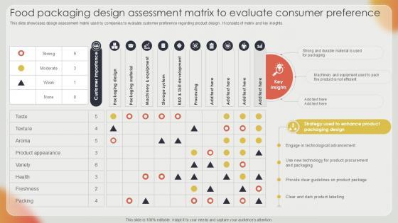 This slide showcases design assessment matrix used by companies to evaluate customer preference regarding product design . It consists of matrix and key insights.Present like a pro with Food Packaging Design Assessment Matrix To Evaluate Consumer Preference. Create beautiful presentations together with your team, using our easy-to-use presentation slides. Share your ideas in real-time and make changes on the fly by downloading our templates. So whether you are in the office, on the go, or in a remote location, you can stay in sync with your team and present your ideas with confidence. With Slidegeeks presentation got a whole lot easier. Grab these presentations today. This slide showcases design assessment matrix used by companies to evaluate customer preference regarding product design . It consists of matrix and key insights.