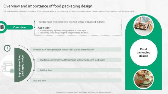 The slide showcases overview and importance of food packaging design as it assists in attracting varied customers in market . It assist in capturing customers from each segment of market . The Overview And Importance Of Food Packaging Design is a compilation of the most recent design trends as a series of slides. It is suitable for any subject or industry presentation, containing attractive visuals and photo spots for businesses to clearly express their messages. This template contains a variety of slides for the user to input data, such as structures to contrast two elements, bullet points, and slides for written information. Slidegeeks is prepared to create an impression. The slide showcases overview and importance of food packaging design as it assists in attracting varied customers in market . It assist in capturing customers from each segment of market .