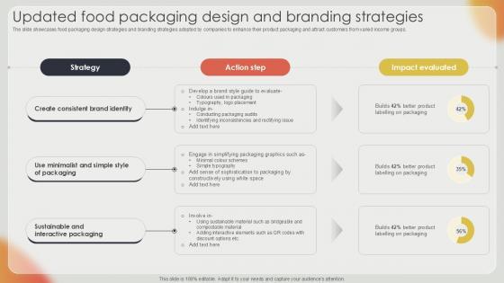 The slide showcases food packaging design strategies and branding strategies adopted by companies to enhance their product packaging and attract customers from varied income groups.Formulating a presentation can take up a lot of effort and time, so the content and message should always be the primary focus. The visuals of the PowerPoint can enhance the presenters message, so our Updated Food Packaging Design And Branding Strategies was created to help save time. Instead of worrying about the design, the presenter can concentrate on the message while our designers work on creating the ideal templates for whatever situation is needed. Slidegeeks has experts for everything from amazing designs to valuable content, we have put everything into Updated Food Packaging Design And Branding Strategies. The slide showcases food packaging design strategies and branding strategies adopted by companies to enhance their product packaging and attract customers from varied income groups.
