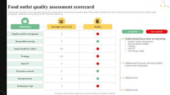 Following slide brings forth a food outlet quality assessment scorecard with the main purpose of evaluating quality of food quality of establishments. Major dimensions covered in the scorecard our supplier quality management, responsible sourcing, training, HACCP, preventive controls, etc. Are you in need of a template that can accommodate all of your creative concepts This one is crafted professionally and can be altered to fit any style. Use it with Google Slides or PowerPoint. Include striking photographs, symbols, depictions, and other visuals. Fill, move around, or remove text boxes as desired. Test out color palettes and font mixtures. Edit and save your work, or work with colleagues. Download Food Outlet Quality Assessment Quality Control Guide For Food PPT PowerPoint and observe how to make your presentation outstanding. Give an impeccable presentation to your group and make your presentation unforgettable. Following slide brings forth a food outlet quality assessment scorecard with the main purpose of evaluating quality of food quality of establishments. Major dimensions covered in the scorecard our supplier quality management, responsible sourcing, training, HACCP, preventive controls, etc.