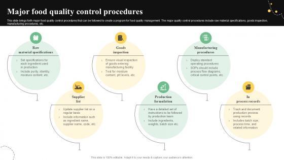 This slide brings forth major food quality control procedures that can be followed to create a program for food quality management. The major quality control procedures include raw material specifications, goods inspection, manufacturing procedures, etc. Retrieve professionally designed Major Food Quality Control Procedures Quality Control Guide For Food PPT Presentation to effectively convey your message and captivate your listeners. Save time by selecting pre-made slideshows that are appropriate for various topics, from business to educational purposes. These themes come in many different styles, from creative to corporate, and all of them are easily adjustable and can be edited quickly. Access them as PowerPoint templates or as Google Slides themes. You do not have to go on a hunt for the perfect presentation because Slidegeeks got you covered from everywhere. This slide brings forth major food quality control procedures that can be followed to create a program for food quality management. The major quality control procedures include raw material specifications, goods inspection, manufacturing procedures, etc.