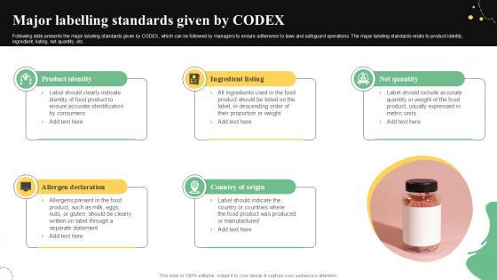 Following slide presents the major labeling standards given by CODEX, which can be followed by managers to ensure adherence to laws and safeguard operations. The major labeling standards relate to product identity, ingredient, listing, net quantity, etc. Slidegeeks has constructed Major Labelling Standards Given Quality Control Guide For Food PPT Template after conducting extensive research and examination. These presentation templates are constantly being generated and modified based on user preferences and critiques from editors. Here, you will find the most attractive templates for a range of purposes while taking into account ratings and remarks from users regarding the content. This is an excellent jumping-off point to explore our content and will give new users an insight into our top-notch PowerPoint Templates. Following slide presents the major labeling standards given by CODEX, which can be followed by managers to ensure adherence to laws and safeguard operations. The major labeling standards relate to product identity, ingredient, listing, net quantity, etc.