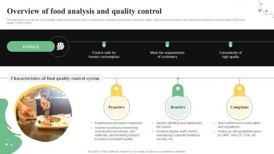 This slide gives an overview of food quality control programs that are to be followed by managers and ensure consumers safety. Major elements covered in the slide are the goals and characteristics of the food quality control system. This Overview Of Food Analysis And Quality Control Guide For Food PPT Slide from Slidegeeks makes it easy to present information on your topic with precision. It provides customization options, so you can make changes to the colors, design, graphics, or any other component to create a unique layout. It is also available for immediate download, so you can begin using it right away. Slidegeeks has done good research to ensure that you have everything you need to make your presentation stand out. Make a name out there for a brilliant performance. This slide gives an overview of food quality control programs that are to be followed by managers and ensure consumers safety. Major elements covered in the slide are the goals and characteristics of the food quality control system.