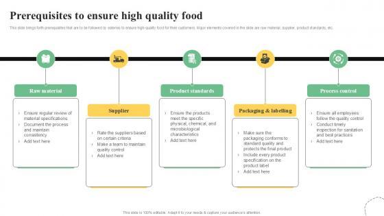 This slide brings forth prerequisites that are to be followed by eateries to ensure high-quality food for their customers. Major elements covered in the slide are raw material, supplier, product standards, etc. Boost your pitch with our creative Prerequisites To Ensure High Quality Control Guide For Food PPT Sample. Deliver an awe-inspiring pitch that will mesmerize everyone. Using these presentation templates you will surely catch everyones attention. You can browse the ppts collection on our website. We have researchers who are experts at creating the right content for the templates. So you do not have to invest time in any additional work. Just grab the template now and use them. This slide brings forth prerequisites that are to be followed by eateries to ensure high-quality food for their customers. Major elements covered in the slide are raw material, supplier, product standards, etc.